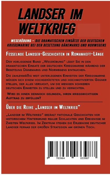 Fesselnde Landser-Geschichten in Romanheft-Länge Der vorliegende Band ¿Weserübung¿ lässt Sie in den dramatischen Einsatz der deutschen Kriegsmarine während der Besetzung Dänemarks und Norwegens eintauchen. Die zahlenmäßig weit unterlegenen Einheiten der Kriegsmarine müssen sich einem hochgerüsteten und hochmotivierten Gegner stellen, der alles versucht, um die wenigen schweren deutschen Einheiten zu stellen und zu vernichten. Wird es den Kampfgruppen der Kriegsmarine dennoch gelingen, ihre feldzugentscheidenden Aufträge zu erfüllen? Über die Reihe ¿Landser im Weltkrieg¿ ¿Landser im Weltkrieg¿ erzählt fiktionale Geschichten vor historischem Hintergrund realer Schlachten und Ereignisse im Zweiten Weltkrieg. Im Zentrum stehen die Erlebnisse deutscher Landser fernab der großen Strategien am grünen Tisch.