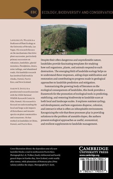 Despite their often dangerous and unpredictable nature, landslides provide fascinating templates for studying how soil organisms, plants and animals respond to such destruction. The emerging field of landslide ecology helps us understand these responses, aiding slope stabilisation and restoration and contributing to the progress made in geological approaches to landslide prediction and mitigation. Summarising the growing body of literature on the ecological consequences of landslides, this book provides a framework for the promotion of ecological tools in predicting, stabilising, and restoring biodiversity to landslide scars at both local and landscape scales. It explores nutrient cycling; soil development; and how soil organisms disperse, colonise and interact in what is often an inhospitable environment. Recognising the role that these processes play in providing solutions to the problem of unstable slopes, the authors present ecological approaches as useful, economical and resilient supplements to landslide management.