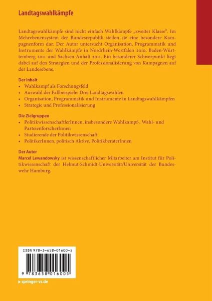 Landtagswahlkämpfe sind nicht einfach Wahlkämpfe "zweiter Klasse". Im Mehrebenensystem der Bundesrepublik stellen sie eine besondere Kampagnenform dar. Der Autor untersucht Organisation, Programmatik und Instrumente der Wahlkämpfe in Nordrhein-Westfalen 2010, Baden-Württemberg 2011 und Sachsen-Anhalt 2011. Ein besonderer Schwerpunkt liegt dabei auf den Strategien und der Professionalisierung von Kampagnen auf der Landesebene.