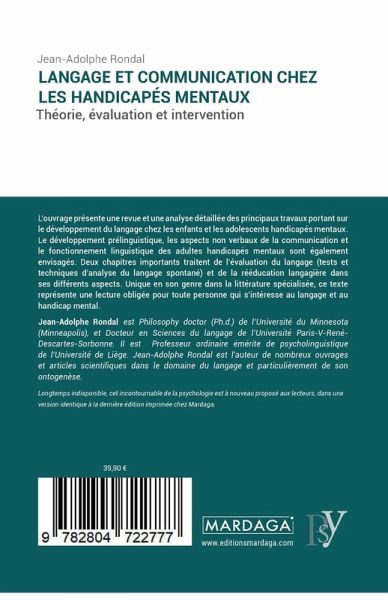 L¿ouvrage présente une revue et une analyse détaillée des principaux travaux portant sur le développement du langage chez les enfants et les adolescents handicapés mentaux. Le développement prélinguistique, les aspects non verbaux de la communication et le fonctionnement linguistique des adultes handicapés mentaux sont également envisagés. Deux chapitres importants traitent de l¿évaluation du langage (tests et techniques d¿analyse du langage spontané) et de la rééducation langagière dans ses différents aspects. Unique en son genre dans la littérature spécialisée, ce texte représente une lecture obligée pour toute personne qui s'intéresse au langage et au handicap mental. Jean-Adolphe Rondal est Philosophy doctor (Ph.d.) de l¿Université du Minnesota (Minneapolis), et Docteur en Sciences du langage de l¿Université Paris-V-René-Descartes-Sorbonne. Il est Professeur ordinaire émérite de psycholinguistique de l¿Université de Liège. Jean-Adolphe Rondal est l¿auteur de nombreux ouvrages et articles scientifiques dans le domaine du langage et particulièrement de son ontogenèse.