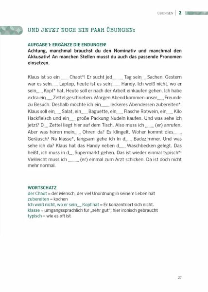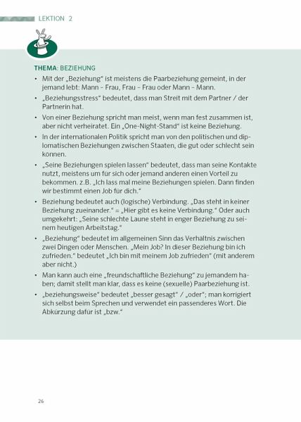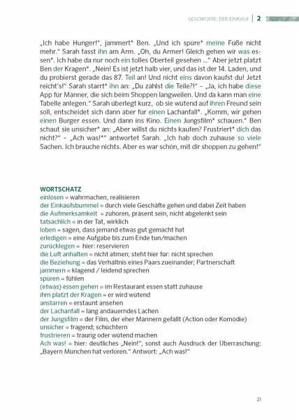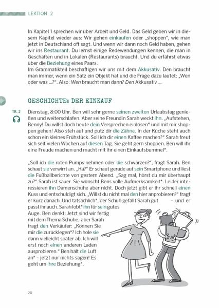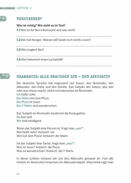 Texte lesen und verstehenWichtige Wörter und Sätze lernenGrammatik verstehen und anwendenIn Übungen checken, ob alles klar istMit witzigen Beispielen und logischen Erklärungen genau das lernen, was du jeden Tag beim Sprechen brauchstDas Audiomaterial findest du ganz praktisch in der Scan2Learn-AppNiveau A2/B1: Elementare bis moderate Sprachkenntnisse