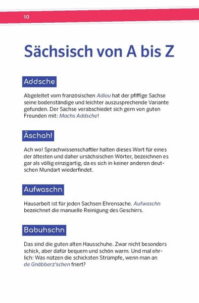 Menschen aus Sachsen sind warmherzig und kommunikativ. Mit ihnen ins Gespräch zu kommen ist gor gein Broblähm, sie zu verstehen hingegen schon. Nicht mit diesem Büchlein! Anhand vieler charmanter Worterklärungen und unterhaltsamer Anekdoten lernen Sie die sächsische Sprache und Mentalität mit all ihren Eigenheiten kennen. Sie werden midd Vorgnieschn von Herzen sächseln und mit Begriffen wie Mouhdschegiebschn, Bemme oder Schnaube jeden Einheimischen beeindrucken.