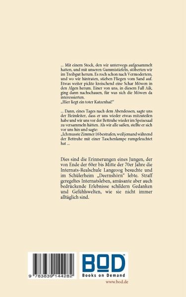 Dies sind die Erinnerungen eines Jungen, der von Ende der 60er bis Mitte der 70er Jahre die Internats-Realschule Langeoog besuchte und im Schülerheim ¿Deernshörn¿ lebte. Straff geregeltes Internatsleben, amüsante aber auch bedrückende Erlebnisse schildern Gedanken und Gefühlswelten, wie sie nicht immer alltäglich sind.