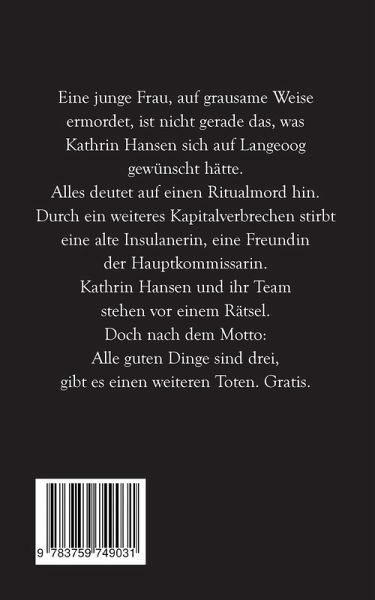 Eine junge Frau, auf grausame Weise ermordet, ist nicht gerade das, was Kathrin Hansen sich auf Langeoog gewünscht hätte. Ihr Lebensgefährte liegt in der Notfall-Klinik, weil er zuvor diese Frau schützen wollte. Eine Fremde, ohne Identität. Ihr Aufenthalt auf der Insel wirft Fragen auf. So richtig verwirrend wird es, als alles auf einen Ritualmord hinweist. Auf eine Bestrafung, die in Ländern des Islam praktiziert wird. Glaubte Kathrin Hansen, schlimmer könnte es nicht kommen, bringt sie der Mord an einer alten Insulanerin völlig aus dem Tritt. Das Opfer ist eine Freundin von ihr, die sie seit ihrer Kindheit kennt. Eine Frau, die überall beliebt ist. Doch nach dem Motto: Alle guten Dinge sind drei, gibt es einen weiteren Toten obendrauf.
