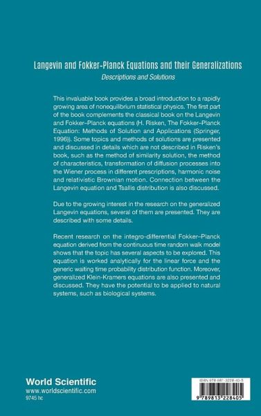 This invaluable book provides a broad introduction to a rapidly growing area of nonequilibrium statistical physics. The first part of the book complements the classical book on the Langevin and Fokker–Planck equations (H. Risken, The Fokker–Planck Equation: Methods of Solution and Applications (Springer, 1996)). Some topics and methods of solutions are presented and discussed in details which are not described in Risken's book, such as the method of similarity solution, the method of characteristics, transformation of diffusion processes into the Wiener process in different prescriptions, harmonic noise and relativistic Brownian motion. Connection between the Langevin equation and Tsallis distribution is also discussed. Due to the growing interest in the research on the generalized Langevin equations, several of them are presented. They are described with some details. Recent research on the integro-differential Fokker–Planck equation derived from the continuous time random walk model shows that the topic has several aspects to be explored. This equation is worked analytically for the linear force and the generic waiting time probability distribution function. Moreover, generalized Klein-Kramers equations are also presented and discussed. They have the potential to be applied to natural systems, such as biological systems.