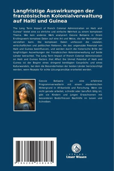 The Long Term Impact of French Colonial Administration on Haiti and Guinea" bietet eine so ehrliche und einfache Wahrheit zu einem komplexen Thema. Wie kein anderes Werk analysiert Gessie Belizaire in ihrem Erstlingswerk komplexe Daten auf eine Art und Weise, die der Normalbürger verstehen kann. Die komplexen Daten umfassen die sozialen, wirtschaftlichen und politischen Faktoren, die das ungenutzte Potenzial von Haiti und Guinea beeinflussen, und werden durch die historische Brille der langfristigen Auswirkungen der französischen Kolonialverwaltung auf beide Länder betrachtet. The Long Term Impact of French Colonial Administration on Haiti and Guinea Factors that Affect the Unmet Potential of Haiti and Guinea ist der Beginn eines dringend benötigten Gesprächs und eines Kulturwandels, bei dem die Besonderheiten der beiden Länder berücksichtigt werden, wenn Rezepte für echte Lösungsansätze erarbeitet werden.
