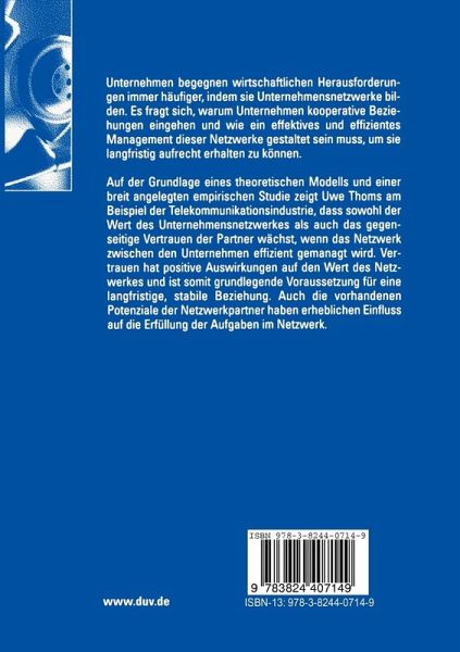 Auf der Grundlage eines theoretischen Modells und einer breit angelegten empirischen Studie zeigt Uwe Thoms am Beispiel der Telekommunikationsindustrie, dass sowohl der Wert des Unternehmensnetzwerkes als auch das gegenseitige Vertrauen der Partner wächst, wenn das Netzwerk zwischen den Unternehmen effizient gemanagt wird. Vertrauen hat positive Auswirkungen auf den Wert des Netzwerkes und ist somit grundlegende Voraussetzung für eine langfristige, stabile Beziehung. Auch die vorhandenen Potenziale der Netzwerkpartner haben erheblichen Einfluss auf die Erfüllung der Aufgaben im Netzwerk.