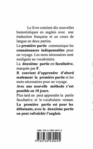 Le livre contient dix nouvelles humoristiques en anglais avec une traduction et un cours de langue en deux parties. La première partie communique les connaissances indispensables pour un voyage. Les mots nécessaires sont soulignés au vocabulaire. La deuxième partie est facultative, marquée par F. Il convient d'apprendre d'abord seulement la première partie et les mots nécessaires pour un voyage. Avec une nouvelle méthode c'est possible en 10 jours. Plus tard on peut apprendre la partie facultative et le vocabulaire restant. La première partie est pour les débutants. Avec la deuxième partie on peut réactiver son anglais.
