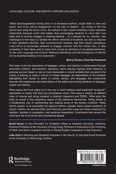 This state-of-the-art exploration of language, culture, and identity is orchestrated through prominent scholars' and teachers' narratives, each weaving together three elements: a personal account based on one or more memorable or critical incidents that occurred in the course of learning or using a second or foreign language; an interpretation of the incidents highlighting their impact in terms of culture, identity, and language; the connections between the experiences and observations of the author and existing literature on language, culture and identity. What makes this book stand out is the way in which authors meld traditional 'academic' approaches to inquiry with their own personalized voices. This opens a window on different ways of viewing and doing research in Applied Linguistics and TESOL. What gives the book its power is the compelling nature of the narratives themselves. Telling stories is a fundamental way of representing and making sense of the human condition. These stories unpack, in an accessible but rigorous fashion, complex socio-cultural constructs of culture, identity, the self and other, and reflexivity, and offer a way into these constructs for teachers, teachers in preparation and neophyte researchers. Contributors from around the world give the book broad and international appeal.
