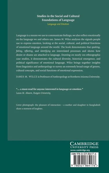 Language is a means we use to communicate feelings; we also reflect emotionally on the language we and others use. James Wilce analyses the signals people use to express emotion, looking at the social, cultural and political functions of emotional language around the world. His book demonstrates that speaking, feeling, reflecting, and identifying are interrelated processes and shows how desire or shame are attached to language. Drawing on nearly one hundred ethnographic case studies, it demonstrates the cultural diversity, historical emergence, and political significance of emotional language. Wilce brings together insights from linguistics and anthropology to survey an extremely broad range of genres, cultural concepts, and social functions of emotional expression.