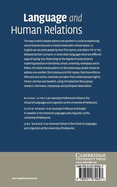 The way in which people address one another is crucial to expressing social relationships and is closely linked with cultural values. In English we call some people by their first names, and others 'Mr' or 'Ms', followed by their surname. In some other languages there are different ways of saying 'you' depending on the degree of social distance. Exploring practices in the family, school, university, the workplace and in letters, this book reveals patterns in the varied ways people choose to address one another, from pronouns to first names, from honorifics to titles and last names. Examples are taken from contemporary English, French, German and Swedish, using rich data from focus group research, interviews, chat groups, and participant observation.