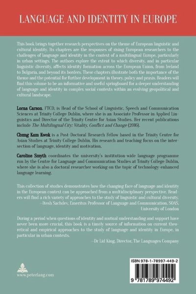 This book brings together research perspectives on the theme of European linguistic and cultural identity. Its chapters are the responses of rising European researchers to the challenges of language and identity in the context of a multilingual Europe, particularly in urban settings. The authors explore the extent to which diversity, and in particular linguistic diversity, affects identity formation across the European Union, from Ireland to Bulgaria, and beyond its borders. These chapters illustrate both the importance of the theme and the potential for further development in theory, policy and praxis. Readers will find this volume to be an informative and useful springboard for a deeper understanding of language and identity in complex social contexts within an evolving geopolitical and cultural landscape.
