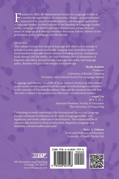 Language and Identity is the third volume of the Readings in Language Studies series published by the International Society for Language Studies, Inc. Edited by Paul Chamness Miller, John L. Watzke, and Miguel Mantero, volume three sustains the society's mission to organize and disseminate the work of its contributing members through peer-reviewed publications. The book presents international perspectives on language and identity in several thematic sections: discourse, culture, identity in the professions, policy, pedagogy, and the learner. A resource for scholars and students, Language and Identity, represents the latest scholarship in new and emergent areas of inquiry.