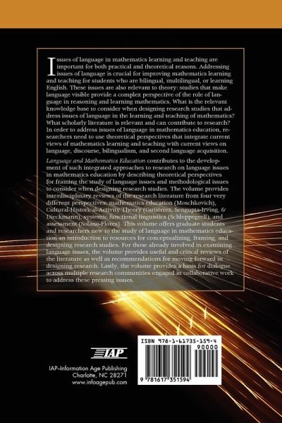 A volume in Research in Mathematics Education Series Editor Barbara J. Dougherty, Iowa State University Marketing description: Issues of language in mathematics learning and teaching are important for both practical and theoretical reasons. Addressing issues of language is crucial for improving mathematics learning and teaching for students who are bilingual, multilingual, or learning English. These issues are also relevant to theory: studies that make language visible provide a complex perspective of the role of language in reasoning and learning mathematics. What is the relevant knowledge base to consider when designing research studies that address issues of language in the learning and teaching of mathematics? What scholarly literature is relevant and can contribute to research? In order to address issues of language in mathematics education, researchers need to use theoretical perspectives that integrate current views of mathematics learning and teaching with current views on language, discourse, bilingualism, and second language acquisition. This volume contributes to the development of such integrated approaches to research on language issues in mathematics education by describing theoretical perspectives for framing the study of language issues and methodological issues to consider when designing research studies. The volume provides interdisciplinary reviews of the research literature from four very different perspectives: mathematics education (Moschkovich), Cultural-Historical-Activity Theory (Gutiérrez, Sengupta-Irving, & Dieckmann), systemic functional linguistics (Schleppegrell), and assessment (Solano-Flores). This volume offers graduate students and researchers new to the study of language in mathematics education an introduction to resources for conceptualizing, framing, and designing research studies. For those already involved in examining language issues, the volume provides useful and critical reviews of the literature as well as recommendations for moving forward in designing research. Lastly, the volume provides a basis for dialogue across multiple research communities engaged in collaborative work to address these pressing issues.