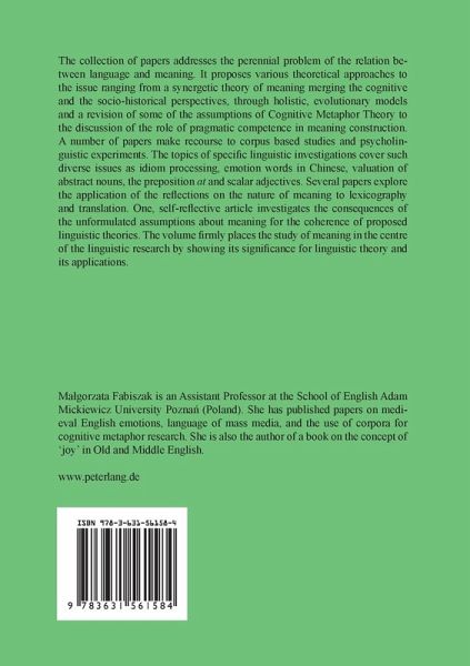 The collection of papers addresses the perennial problem of the relation between language and meaning. It proposes various theoretical approaches to the issue ranging from a synergetic theory of meaning merging the cognitive and the socio-historical perspectives, through holistic, evolutionary models and a revision of some of the assumptions of Cognitive Metaphor Theory to the discussion of the role of pragmatic competence in meaning construction. A number of papers make recourse to corpus based studies and psycholinguistic experiments. The topics of specific linguistic investigations cover such diverse issues as idiom processing, emotion words in Chinese, valuation of abstract nouns, the preposition at and scalar adjectives. Several papers explore the application of the reflections on the nature of meaning to lexicography and translation. One, self-reflective article investigates the consequences of the unformulated assumptions about meaning for the coherence of proposed linguistic theories. The volume firmly places the study of meaning in the centre of the linguistic research by showing its significance for linguistic theory and its applications.