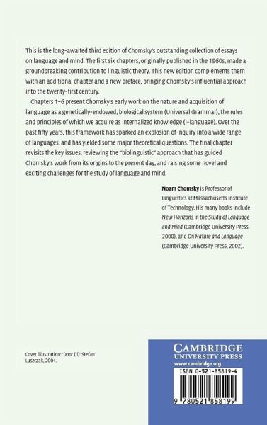 This is the third edition of Chomsky's outstanding collection of essays on language and mind, first published in 2006. The first six chapters, originally published in the 1960s, made a groundbreaking contribution to linguistic theory. This edition complements them with an additional chapter and a new preface, bringing Chomsky's influential approach into the twenty-first century. Chapters 1-6 present Chomsky's early work on the nature and acquisition of language as a genetically endowed, biological system (Universal Grammar), through the rules and principles of which we acquire an internalized knowledge (I-language). Over the past fifty years, this framework has sparked an explosion of inquiry into a wide range of languages, and has yielded some major theoretical questions. The final chapter revisits the key issues, reviewing the 'biolinguistic' approach that has guided Chomsky's work from its origins to the present day, and raising some novel and exciting challenges for the study of language and mind.