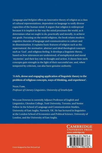 Language and Religion offers an innovative theory of religion as a class of cultural representations, dependent on language to unify diverse capacities of the human mind. It argues that religion is widespread because it is implicit in the way the mind processes the world, as it determines what we ought to do, practically and morally, to achieve our goals. Focusing on the world religions, the book relates modern cognitive theories of language and communication to culture and its dissemination. It explains basic features of religion such as the supernatural, the normative, abstract and ideal theological concepts such as 'God', and religious feeling. It develops a linguistic theory, based on how utterances are understood, of metaphysical and moral 'mysteries' and their key role in thought and action. It shows how such concepts gain strength in the light of their successful use and, when tempered by criticism, can also have genuine authority.