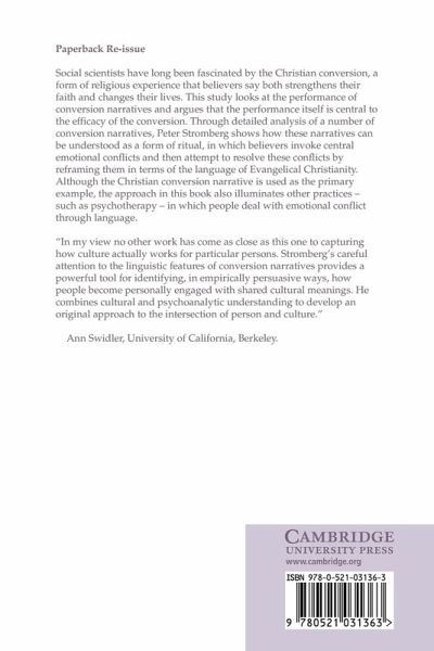 Social scientists have long been fascinated by the Christian conversion, a form of religious experience that believers say both strengthens their faith and changes their lives. This study looks at the performance of conversion narratives and argues that the performance itself is central to the efficacy of the conversion. Through detailed analysis of a number of conversion narratives, Peter Stromberg shows how these narratives can be understood as a form of ritual, in which believers invoke central emotional conflicts and then attempt to resolve these conflicts by reframing them in terms of the language of Evangelical Christianity. Although the Christian conversion narrative is used as the primary example, the approach in this book also illuminates other practices - such as psychotherapy - in which people deal with emotional conflict through language.