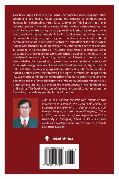 This book argues that while humans communicate using language, they create and use media. Media extend the distance of communication. Humans form themselves into a large community. This happens in a long historical process in which the state of the civilized society replaces the tribe of the primitive society. Language replaces kinship in playing a role in the formation of human society. Then this book argues that while humans communicate using language, they form political, economic and cultural communities which in turn jointly sustain the formation of the state. While humans use language in communication, they also create a series of language solutions to the organization of the state. They make a constitution, hold elections and even set up representation when they govern their state in the principle of democracy. Extending the distance of linguistic communication also underlies the formation of government as well as the emergence of three juxtaposing branches of government-administrative, legislative and judicial bodies. By using language in long-distance linguistic communication, humans further create their history, philosophy, literature, art, religion and law which play a role in the construction of people's spirit that guides the operation and the future development of the state. Language not only gives origin to the state but also presets the whole process of the development of the state. This book offers one of the most systematic theories about the formation, the building and the future of the state.
