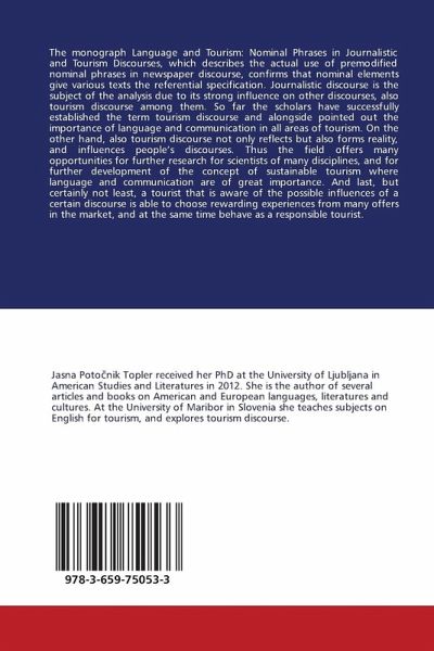 The monograph Language and Tourism: Nominal Phrases in Journalistic and Tourism Discourses, which describes the actual use of premodified nominal phrases in newspaper discourse, confirms that nominal elements give various texts the referential specification. Journalistic discourse is the subject of the analysis due to its strong influence on other discourses, also tourism discourse among them. So far the scholars have successfully established the term tourism discourse and alongside pointed out the importance of language and communication in all areas of tourism. On the other hand, also tourism discourse not only reflects but also forms reality, and influences people's discourses. Thus the field offers many opportunities for further research for scientists of many disciplines, and for further development of the concept of sustainable tourism where language and communication are of great importance. And last, but certainly not least, a tourist that is aware of the possible influences of a certain discourse is able to choose rewarding experiences from many offers in the market, and at the same time behave as a responsible tourist.