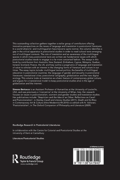 This collection gathers together a stellar group of contributors offering innovative perspectives on the issues of language and translation in postcolonial studies. In a world where bi- and multilingualism have become quite normal, this volume identifies a gap in the critical apparatus in postcolonial studies in order to read cultural texts emerging out of multilingual contexts. The role of translation and an awareness of the multilingual spaces in which many postcolonial texts are written are fundamental issues with which postcolonial studies needs to engage in a far more concerted fashion. The essays in this book by contributors from Australia, New Zealand, Zimbabwe, Cyprus, Malaysia, Quebec, Ireland, France, Scotland, the US, and Italy outline a pragmatics of language and translation of value to scholars with an interest in the changing forms of literature and culture in our times. Essay topics include: multilingual textual politics; the benefits of multilingual education in postcolonial countries; the language of gender and sexuality in postcolonial literatures; translational cities; postcolonial calligraphy; globalization and the new digital ecology.