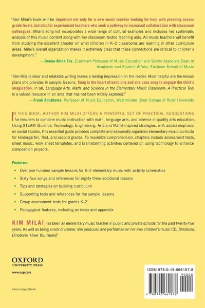 * Dedication * Acknowledgements * Part One: Introduction * The Elementary Class: Transitioning to the Future * Using the National Core Arts Music Standards as a Tool * Subject Integration * What is STEM and NGSS? * A Word About STEAM * What This Practical Guide Includes * Rationale: How is the Music Class Evolving? * My Philosophy of Music Education: The Body/Brain Connection * Teaching Examples * Pedagogy * Why should we be open to adding other subjects within the music lesson? * To Discuss or Complete * Part Two: Lesson Plans * Lesson Overview * How to Get Started: The Process in Metaphor * Leaving the Metaphor * National Core Arts Music Standards * Tips on Creating Questions * Lesson Building Blocks * Include Popular Music * Composition and Improvisation: Where Do They Fit Into the New Standards? * Integrating Basic Subjects with the Music Curriculum * The Class * To Discuss or Complete * Keys * Kindergarten * September 1-4 * October 5-8 * November 9-12 * December 13-16 * January 17-20 * February 21-24 * March 25-28 * April 29-32 * May 33-36 * Kindergarten Resources * KINDERGARTEN GROUP MUSIC ASSESSMENT TEST * KINDERGARTEN CONCEPT CODE MATRIX * Kindergarten Song List * First Grade * September 1-4 * October 5-8 * November 9-12 * December 13-16 * January 17-20 * February 21-24 * March 25-28 * April 29-32 * May 33-36 * FIRST GRADE GROUP MUSIC ASSESSMENT TEST * FIRST GRADE CONCEPT CODE MATRIX * First Grade Song List * Second Grade * September 1-4 * October 5-8 * November 9-12 * December 13-16 * January 17-20 * February 21-24 * March 25-28 * April 29-32 * May 33-36 * SECOND GRADE GROUP MUSIC ASSESSMENT TEST * SECOND GRADE CONCEPT CODE MATRIX * Second Grade Song List * Acoustics: Definitions * Acoustics: Decibels * Composer Unit * Turn the Glasses Over * Part Three: Songs * Song List * Part Four: Coded Concepts * Overview * Music * Math * Language Arts * Science * Social Studies * Part Five: Appendix * American and World Culture Month to Month * Assembly and Concert Suggestions * Bibliography * Classical and Folk Listening Lists * Copyright Information * Lesson Template * Group Exploration: Descriptive Music Words * National Recess Week * Online Support * Music Notation Printouts * Storybooks and Picture Books * Indexes