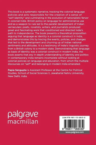 This book is a systematic narrative, tracking the colonial language policies and acts responsible for the creation of a sense of "self-identity" and culminating in the evolution of nationalistic fervor in colonial India. British policy on language for administrative use and as a weapon to rule led to the parallel development of Indian vernaculars: poets, novelists, writers and journalists produced great and fascinating work that conditioned and directed India's path to independence. The book presents a theoretical proposition arguing that language as identity is a colonial construct in India, and demonstrates this by tracing the events, policies and changes that led to the development and churning up of Indian national sentiments and attitudes. It is a testimony of India's linguistic journey from a British colony to a modern state. Demonstrating that language as basis of identity was a colonial construct in modern India, the book asserts that any in-depth understanding of identity and politics in contemporary India remains incomplete without looking at colonial policies on language and education, from which the multiple discourses on "self" and belonging in modern India emanated.