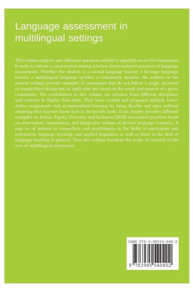 This volume explores and addresses questions related to equitable access for assessment. It seeks to initiate a conversation among scholars about inclusive practices in language assessments. Whether the student is a second language learner, a heritage language learner, a multilingual language speaker, a community member, the authors in the present volume provide examples of assessment that do not follow a single universal or standardized design but an applicable one based on the needs and context of a given community. The contributors in this volume are scholars from different disciplines and contexts in Higher Education. They have created and proposed multiple lower-stakes assignments and accommodated learning by being flexible and open without assuming that learners know how to do specific tasks. Each chapter provides different examples on Justice, Equity, Diversity, and Inclusion (JEDI) assessment practices based on observation, examination, and integrative notions of diverse language scenarios. It may be of interest to researchers and practitioners in the fields of curriculum and instruction, language learning, and applied linguistics as well as those in the field of language teaching in general. Thus this volume broadens the scope of research in the area of multilingual assessment.