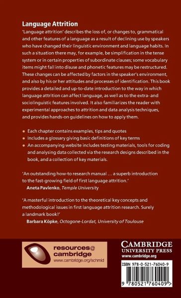 'Language attrition' describes the loss of, or changes to, grammatical and other features of a language as a result of declining use by speakers who have changed their linguistic environment and language habits. In such a situation there may, for example, be simplification in the tense system or in certain properties of subordinate clauses; some vocabulary items might fall into disuse and phonetic features may be restructured. These changes can be affected by features of the speaker's environment, but also by his or her attitudes and processes of identification. This book provides a detailed and up-to-date introduction to the way in which language attrition can affect language, as well as to the extra- and sociolinguistic features involved. It also familiarizes the reader with experimental approaches to attrition and data analysis techniques and provides hands-on guidelines on how to apply them.