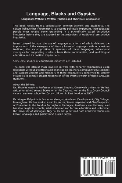 This book results from a collaboration between activists and academics. The editors believe that if grammar is to become politically important, then educated people must receive some grounding in a scientifically based descriptive linguistics before they are exposed to the prejudices of traditional prescriptive linguistics. Issues covered include: the use of language as a form of ethnic defence; the implications of the emergence of literary forms of languages without a written tradition; the social position of speakers of these languages; educational strategies for supporting students from these communities; and multilingual education and its political implications. Some case studies of educational initiatives are included. The book will interest those involved in work with minority communities using languages without a written tradition including teachers, community development and support workers and members of these communities concerned to identify strategies to achieve greater recognition of the intrinsic worth of these language traditions. About the Editors: Dr Thomas Acton is Professor of Romani Studies, Greenwich University. He has written or edited several books on or for Gypsies. He ran the first Gypsy Council caravan summer school for Gypsy children in East London in 1967. Dr Morgan Dalphinis is Executive Manager, Academic Development , City College Birmingham. He has worked as an Inspector, Senior inspector and Chief Inspector of Education in the London Boroughs of Haringey, Southwark and Hackney, and has also taught in Schools, adult education and further education and lectured at the University of Maiduguri, Nigeria. He has published both academic studies on Creole languages and poetry in St Lucian Patwa.