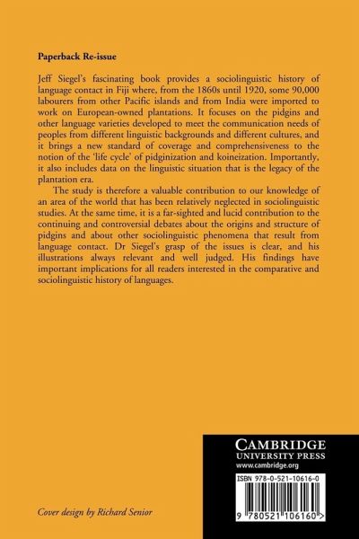 Jeff Siegel's fascinating book provides a sociolinguistic history of language contact in Fiji where, from the 1860s until 1920, some 90,000 labourers from other Pacific islands and from India worked on the European-owned plantations.