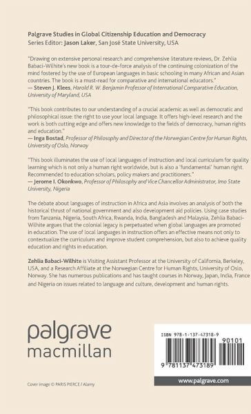 The debate about languages of instruction in Africa and Asia involves an analysis of both the historical thrust of national government and also development aid policies. Using case studies from Tanzania, Nigeria, South Africa, Rwanda, India, Bangladesh and Malaysia, Zehlia Babaci-Wilhite argues that the colonial legacy is perpetuated when global languages are promoted in education. The use of local languages in instruction not only offers an effective means to contextualize the curriculum and improve student comprehension, but also to achieve quality education and rights in education.