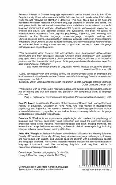 Sam-Po Law is an Associate Professor at the Division of Speech and Hearing Sciences, Faculty of Education, University of Hong Kong. She was trained in developmental psychology and linguistics. Her research interests in Chinese language disorders include acquired dyslexia and dysgraphia, lexical and sentence processing deficits, and language rehabilitation of individuals with aphasia. Brendan Weekes is an experimental psychologist who studies the psychology of language and memory - specifically word recognition and recall. He examines cognitive processes using cross-linguistic, neuropsychological and brain imaging methods. His research can be applied to understanding problems in clinical neuropsychology including bilingual aphasia, dementia and reading difficulties. Anita Wong is an Assistant Professor at the Division of Speech and Hearing Sciences, Faculty of Education, University of Hong Kong. A speech-language pathologist by training, she has worked with English- and Chinese-speaking children with developmental speech and language disorders. Her current research interests include the early identification of language impairment, and the underlying linguistic and cognitive deficits in Cantonese-speaking children with SLI.