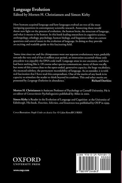 Some time since we and the chimpanzees went our separate evolutionary ways, probably towards the very end of that 6 million year period, an innovation occurred whose only precedent was arguably the DNA code itself. Language arose in our ancestors, and there had been nothing like it. Of course other species communicate, many of them vocally, but none of this comes close to the open-ended, generative capacity, the huge vocabulary, the nuanced subtlety, the permanent recordability of language. As an outsider, it is with real fascination that I have read this compendium. One of the merits of any book is its capacity to stimulate the reader to think beyond its confines. This, and other merits are possessed by Language Evolution in abundance. Richard Dawkins