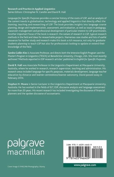 Sandra Gollin-Kies is an Associate Professor, Director of Intensive English and co-creator of the Masters Program in Linguistics (TESOL) at Benedictine University, Chicago, USA. She most recently authored "Methods reported in ESP research articles" published in English for Specific Purposes. David Hall was an Associate Professor in the Linguistics Department at Macquarie University, Australia, where he worked in research, research supervision, teaching, and administration. His research areas included language for specific purposes, materials development, language teacher education by distance, and learner-centredness /learner autonomy. David passed away in February 2014. Stephen Moore is a Senior Lecturer in the Linguistics Department at Macquarie University, Australia. He has worked in the fields of ELT, ESP, discourse analysis, and language assessment for more than 20 years. His recent research has included investigating the discourse of financial planners and the spoken discourse of accountants.
