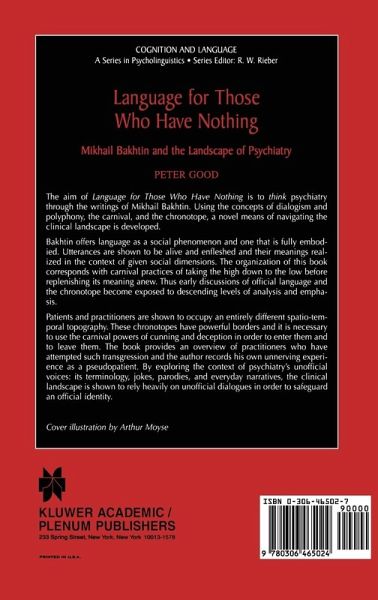The aim of Language for those who have Nothing is to think psychiatry through the writings of Mikhail Bakhtin. Using the concepts of Dialogism and Polyphony, the Carnival and the Chronotope, a novel means of navigating the clinical landscape is developed.