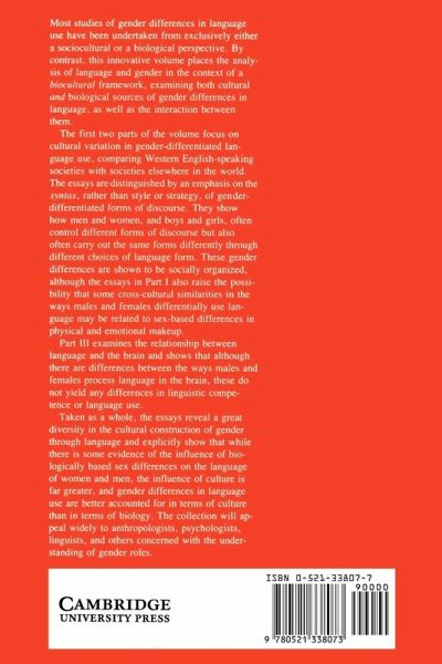 The aim of this innovative volume is to analyze both the cultural and the biological sources of gender differences in language use. The first two parts of the volume focus on cultural variation in gender-differentiated language use, comparing Western English-speaking societies with others from elsewhere in the world. Part III examines the relationship between language and the brain, showing that although there are differences in males' and females' processing of language in the brain, these do not yield any gender differences in language use. Overall, the volume points to the greater salience of cultural processes over biological processes in the shaping of gender.