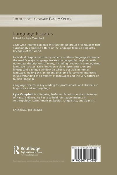 List of Figures List of Maps List of Tables List of Contributors Introduction (Lyle Campbell) Chapter 1 Language Isolates and their history (Lyle Campbell) Chapter 2 Ancient Near Eastern and European isolates (Piotr Michalowski) Chapter 3 Basque and the reconstruction of isolated languages (Joseba A. Lakarra) Chapter 4 Ainu (Thomas Dougherty) Chapter 5 Burushaski (Alexander D. Smith) Chapter 6 Other isolated languages of Asia (Stefan Georg) Chapter 7 African language isolates (Roger Blench) Chapter 8 Language isolates of North America (Marianne Mithun) Chapter 9 Language isolates of Mesoamerica and Northern Mexico (Raina Heaton) Chapter 10 Language isolates in South America (Frank Seifart and Harald Hammarström) Chapter 11 Language isolates in the New Guinea region (Harald Hammarström) Chapter 12 Language isolates of Australia (Claire Bowern) Chapter 13 Endangerment of language isolates (Eve Okura) References Index