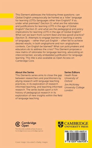 This Element concerns language learning in the age of Global English. Learning just English fails to achieve the desired results. It proposes a new matrix of rationales for language learning, advocating an interconnected, socially embedded justification for language learning. This title is also available as Open Access on Cambridge Core.