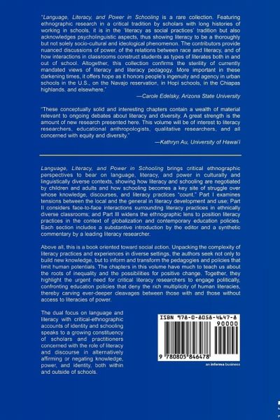 Language, Literacy, and Power in Schooling brings critical ethnographic perspectives to bear on language, literacy, and power in culturally and linguistically diverse contexts, showing how literacy and schooling are negotiated by children and adults and how schooling becomes a key site of struggle over whose knowledge, discourses, and literacy practices "count." Part I examines tensions between the local and the general in literacy development and use; Part II considers face-to-face interactions surrounding literacy practices in ethnically diverse classrooms; and Part III widens the ethnographic lens to position literacy practices in the context of globalization and contemporary education policies. Each section includes a substantive introduction by the editor and a synthetic commentary by a leading literacy researcher. Above all, this is a book oriented toward social action. Unpacking the complexity of literacy practices and experiences in diverse settings, the authors seek not only to build new knowledge, but to inform and transform the pedagogies and policies that limit human potentials. The chapters in this volume have much to teach us about the roots of inequality and the possibilities for positive change. Together, they highlight the urgent need for critical literacy researchers to engage politically, confronting education policies that deny the rich multiplicity of human literacies, thereby carving ever-deeper cleavages between those with and without access to literacies of power. The dual focus on language and literacy with critical-ethnographic accounts of identity and schooling speaks to a growing constituency of scholars and practitioners concerned with the role of literacy and discourse in alternatively affirming or negating knowledge, power, and identity, both within and outside of schools.