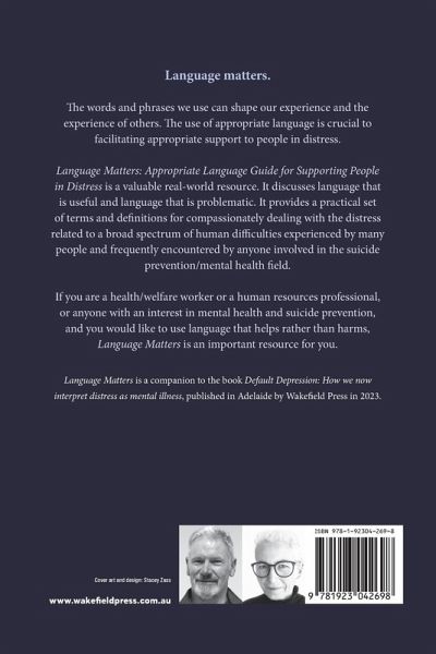 Language matters. The words and phrases we use can shape our experience and the experience of others. The use of appropriate language is crucial to facilitating appropriate support to people in distress. Language Matters: Appropriate Language Guide for Supporting People in Distress is a valuable real-world resource. It discusses language that is useful and language that is problematic. It provides a practical set of terms and definitions for compassionately dealing with the distress related to a broad spectrum of human difficulties experienced by many people and frequently encountered by anyone involved in the suicide prevention/mental health field. If you are a health/welfare worker or a human resources professional, or anyone with an interest in mental health and suicide prevention, and you would like to use language that helps rather than harms, Language Matters is an important resource for you. Language Matters is a companion to the book Default Depression: How we now interpret distress as mental illness, published in Adelaide by Wakefield Press in 2023.