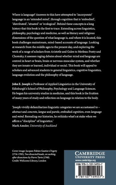 Where is language? Answers to this have attempted to 'incorporate' language in an 'extended mind', through cognition that is 'embodied', 'distributed', 'situated' or 'ecological'. Behind these concepts is a long history that this book is the first to trace. Extending across linguistics, philosophy, psychology and medicine, as well as literary and religious dimensions of the question of what language is, and where it is located, this book challenges mainstream, mind-based accounts of language. Looking at research from the Middle Ages to the present day, and exploring the work of a range of scholars from Aristotle and Galen to Merleau-Ponty and Chomsky, it assesses raging debates about whether mind and language are centred in heart or brain, brain or nervous-muscular system, and whether they are innate or learned, individual or social. This book will appeal to scholars and advanced students in historical linguistics, cognitive linguistics, language evolution and the philosophy of language.