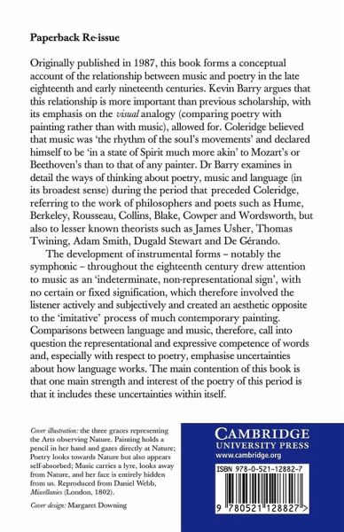 Originally published in 1987, this book forms a conceptual account of the relationship between music and poetry in the late eighteenth and early nineteenth centuries. Kevin Barry argues that this relationship is more important than previous scholarship, with its emphasis on the visual analogy (comparing poetry with painting rather than with music), allowed for. Coleridge believed that music was 'the rhythm of the soul's movements' and declared himself to be 'in a state of Spirit much more akin' to Mozart's or Beethoven's than to that of any painter. Dr Barry examines in detail the ways of thinking about poetry, music and language (in its broadest sense) during the period that preceded Coleridge, referring to the work of philosophers and poets such as Hume, Berkeley, Rousseau, Collins, Blake, Cowper and Wordsworth, but also to lesser-known theorists such as James Usher, Thomas Twining, Adam Smith, Dugald Stewart and de Gerando.