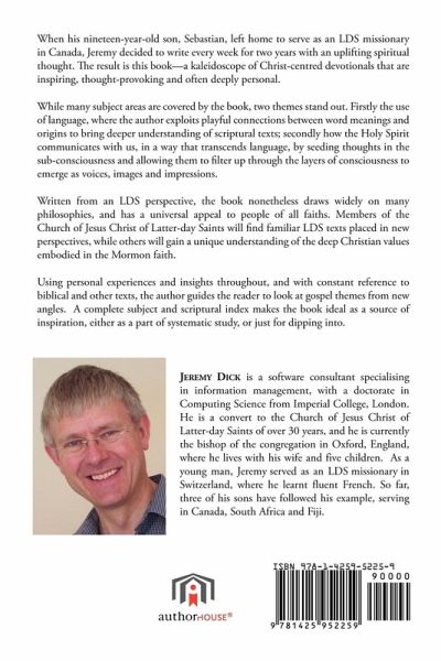 When his nineteen-year-old son, Sebastian, left home to serve as an LDS missionary in Canada, Jeremy decided to write every week for two years with an uplifting spiritual thought. The result is this book¿a kaleidoscope of Christ-centered devotionals that are inspiring, thought-provoking and often deeply personal. While many subject areas are covered by the book, two themes stand out. Firstly the use of language, where the author exploits playful connections between word meanings and origins to bring deeper understanding of scriptural texts; secondly how the Holy Spirit communicates with us, in a way that transcends language, by seeding thoughts in the sub-consciousness and allowing them to filter up through the layers of consciousness to emerge as voices, images and impressions. Written from an LDS perspective, the book nonetheless draws widely on many philosophies, and has a universal appeal to people of all faiths. Members of the Church of Jesus Christ of Latter-day Saints will find familiar LDS texts placed in new perspectives, while others will gain a unique understanding of the deep Christian values embodied in the Mormon faith. Using personal experiences and insights throughout, and with constant reference to biblical and other texts, the author guides the reader to look at gospel themes from new angles. A complete subject and scriptural index makes the book ideal as a source of inspiration, either as a part of systematic study, or just for dipping into.