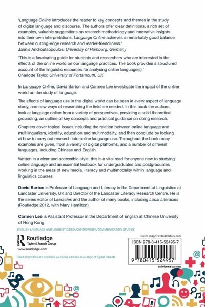 In Language Online David Barton and Carmen Lee investigate the impact of the online world on the study of language. The effects of language use in the digital world can be seen in every aspect of language study, and as such new ways of researching the field are needed. In this book the authors look at language online from a variety of perspectives, providing a solid theoretical grounding, along with key concepts, but also incorporate essential practical elements.