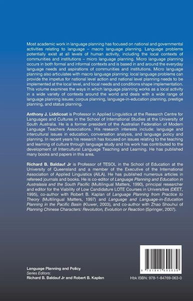 Language problems potentially exist at all levels of human activity, including the local contexts of communities and institutions. This volume examines the ways in which language planning works as a local activity in a wide variety of contexts around the world and dealing with a wide range of language planning issues.