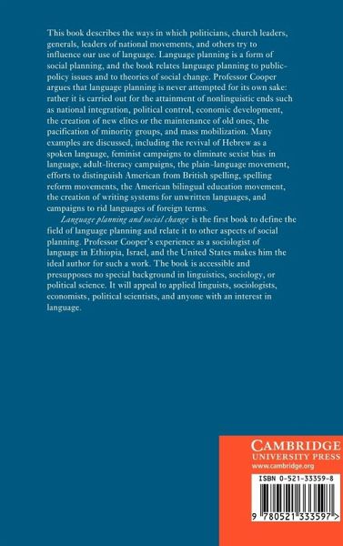 This book describes the ways in which politicians, church officials, generals, and other leaders try to influence our use of language. Using many examples, Professor Cooper argues that language planning is never attempted for its own sake, but rather for the attainment of nonlinguistic ends. Examples discussed include the revival of Hebrew as a spoken language, feminist campaigns to eliminate sexist bias in language, adult literacy campaigns, the plain language movement, efforts to distinguish American from British spelling, the American bilingual education movement, the creation of writing systems for unwritten languages, and campaigns to rid languages of foreign terms. This is the first book to define the field of language planning and relate it to other aspects of social planning and to social change.