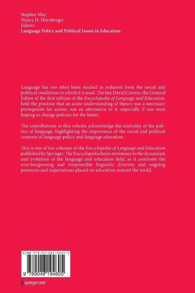 Language has too often been studied in isolation from the social and political conditions in which it is used. The late David Corson, the General Editor of the first edition of the Encyclopedia of Language and Education, held the position that an acute understanding of theory was a necessary prerequisite for action, not an alternative to it, especially if one were hoping to change policies for the better.The contributions in this volume acknowledge the centrality of the politics of language, highlighting the importance of the social and political contexts of language policy and language education.This is one of ten volumes of the Encyclopedia of Language and Education. The Encyclopedia bears testimony to the dynamism and evolution of the language and education field, as it confronts the ever-burgeoning and irrepressible linguistic diversity and ongoing pressures and expectations placed on education around the world.