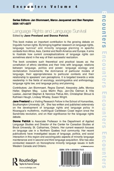 Jane Freeland is a Visiting Research Fellow in the School of Humanities, Southampton University, UK. She has written and published extensively on the development of language rights and language policy in Nicaragua's multiethnic, multilingual Caribbean Coast region since the Sandinista revolution, and on their significance for the language rights debate. Donna Patrick is Associate Professor in the Department of Canadian Studies and the Department of Sociology and Anthropology at Carleton University, Ottawa, Ontario. Her current research focuses on language use in a Northern Quebec Inuit community. Her recent publications have investigated issues of language, politics, and social interaction in this region and sociolinguistic aspects of minority language maintenance and in second and third language acquisition.