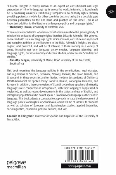 This book examines the language policies in the constitutions, legal statutes, and regulations of Sweden, Denmark, Norway, Iceland, the Faroe Islands, and Greenland. In these countries and territories, modern descendants of Old Norse (North Germanic) are spoken today: Swedish, Danish, Norwegian, Icelandic, and Faroese. In addition, there are regions of Scandinavia where speakers of minority languages were conquered or incorporated, with their languages suppressed or neglected, as well as recent developments in the status and use of English, and immigrant populations who do not speak a Scandinavian language as their native language. This book adopts a comparative approach to trace the development of language policies and rights in Scandinavia, and it will be of interest to students as well as scholars of European and Scandinavian studies, applied linguistics, sociolinguistics, education, political science, and law.
